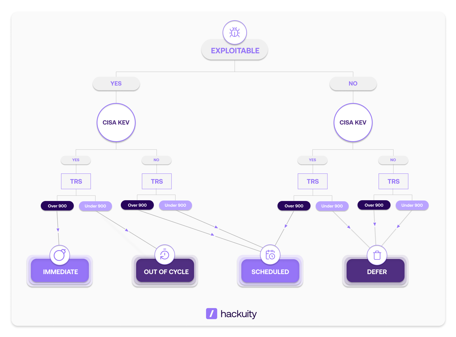 The tree structure you build determines how findings flow into your four remediation pools. Organizations with high capacity can route more vulnerabilities to IMMEDIATE and OUT OF CYCLE. Smaller teams need conservative trees that prioritize only the most critical combinations into urgent pools.